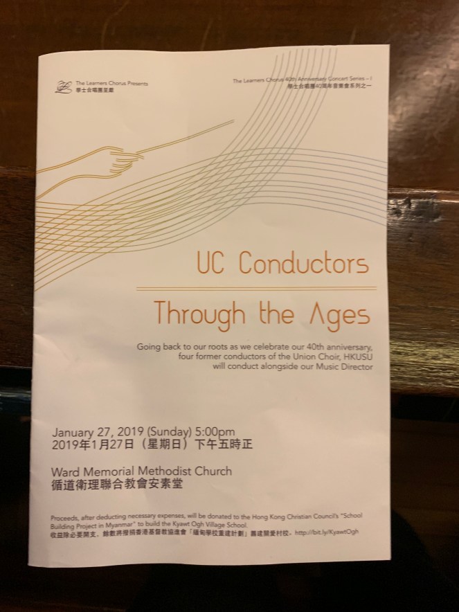 昨晚,朋友最近參加了一個合唱團,在教堂舉行的音樂會,我當然要支持一下。這個合唱團在70年代由港大的Union Choir 組成的,慢慢地聚集了一班自細已經唱Choir的人,功力直逼外國的合唱團,你好難想像香港有這麼的一團人。