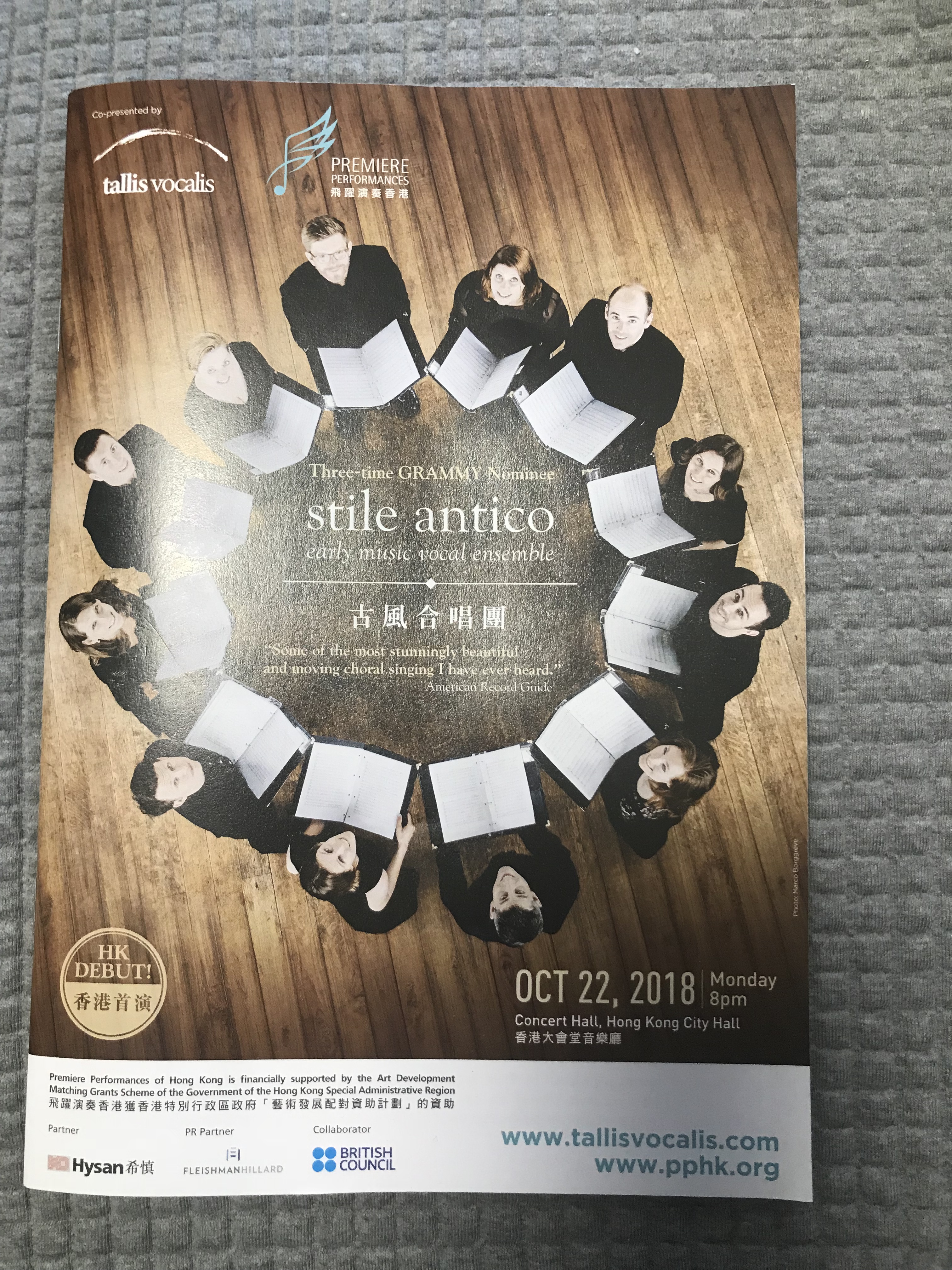 昨晚,欣賞了一場精采的16世紀的音樂會。他們12人的共鳴位置係一樣的,所以就做到12人彷如1人發聲的效果,尤其係其中2個女高音,如果唔係見到佢個口,你唔會聽得出原來係2個女高音係度對唱緊。